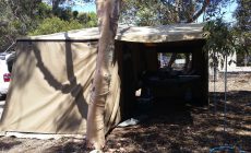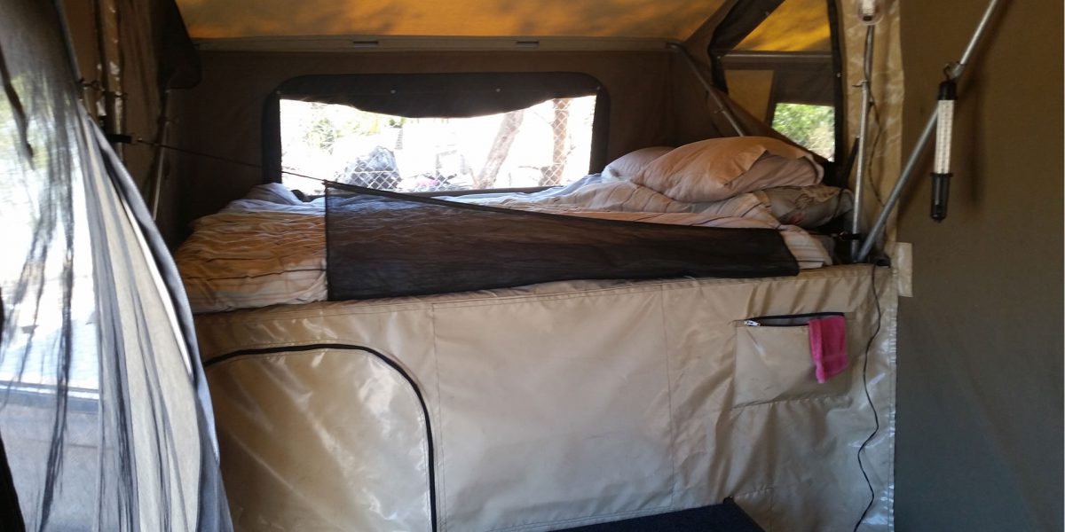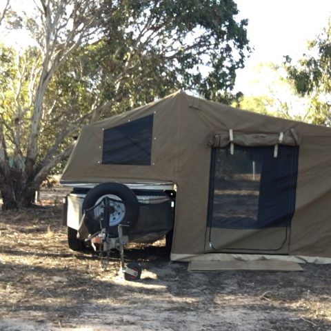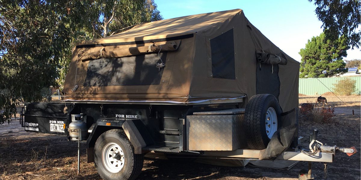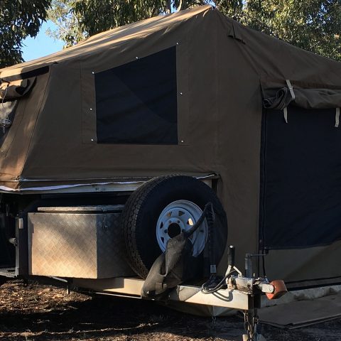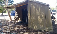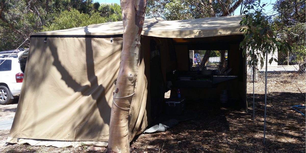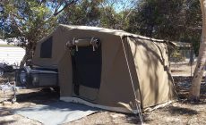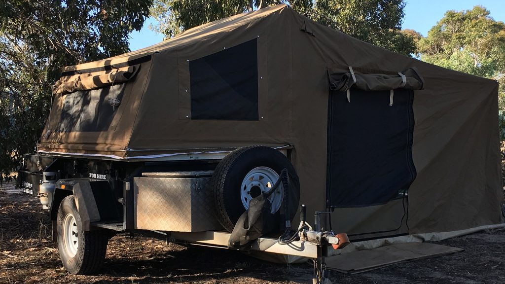 Each camper trailer also has an optional awning for the kitchen area, with sides to enclose you in during inclement weather. All camper trailers, but one, have off-road tyres, designed to easily handle your adventure wherever you go. The tents are made from heavy-duty canvas, with a sealed vinyl floor and fully enclosed fly-screen windows and doors for ventilation.