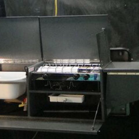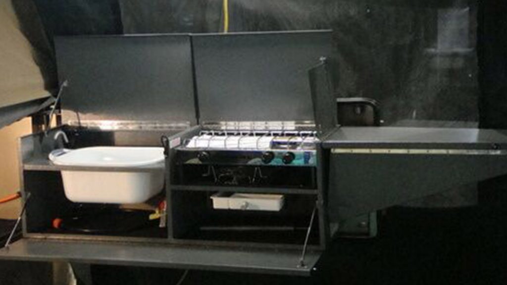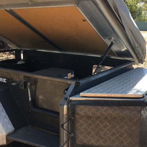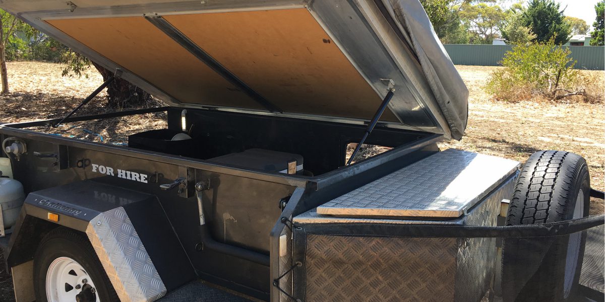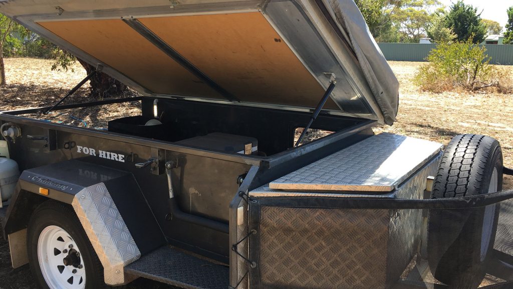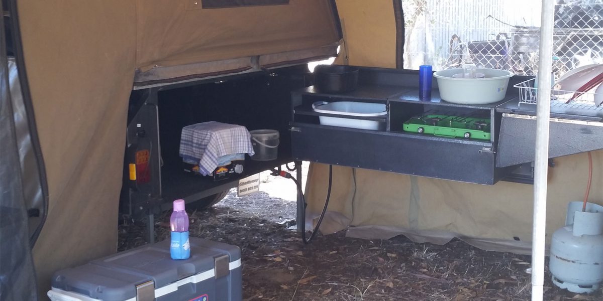 Challenge Camper Trailers all have an inner-spring queen size mattress, plenty of tent space for additional bedding for the kids and a pull-out kitchen conveniently built into the tailgate. There’s huge storage in the trailer, accessible via the main frame which lifts easily using gas struts. There are 3 different tent sizes, depending on how many are travelling – 10ft, 12ft & 14ft.